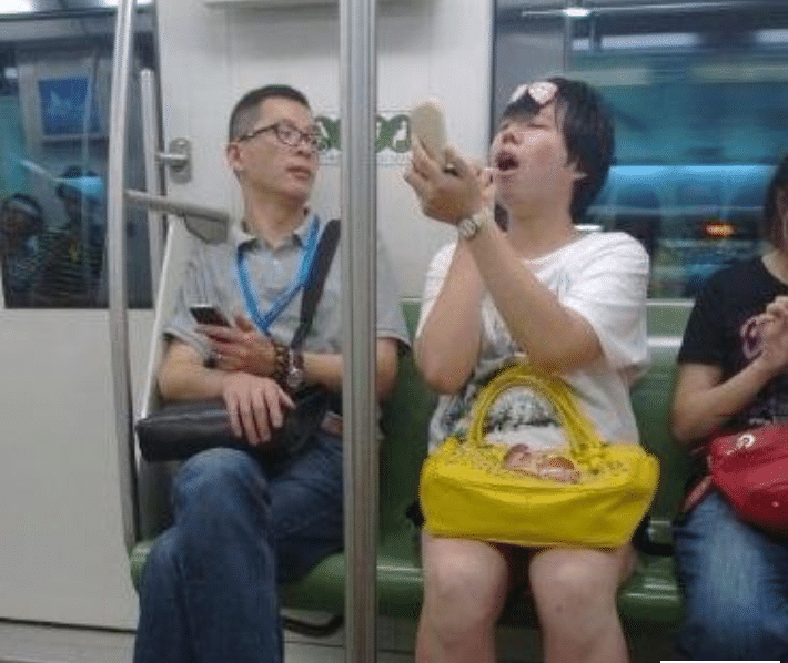 “妹子在地铁化妆,把旁边大哥吓坏了!”哈哈哈哈哈哪里来的妖孽