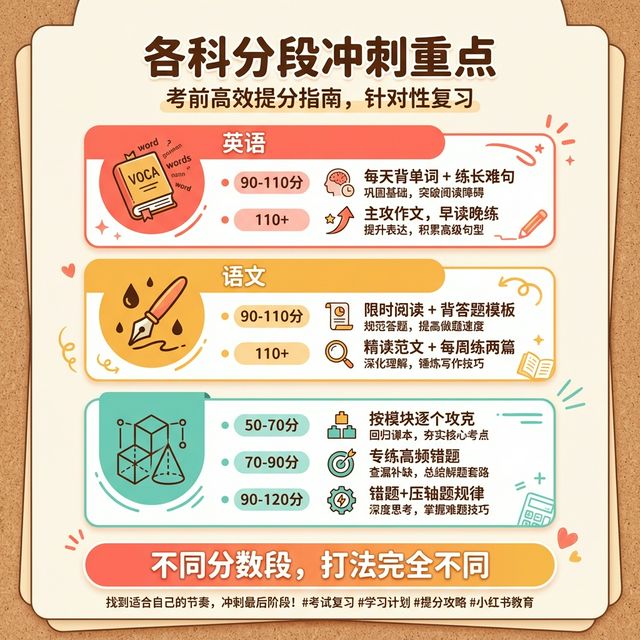 90到110这个分段的孩子,每天早上必须背单词,雷打不动。但光背不够,还得练长难句。很多孩子阅读慢、做不对,不是因为词不认识,是句子太长看不懂结构。针对性练句子拆分,速度和正确率都能上来。