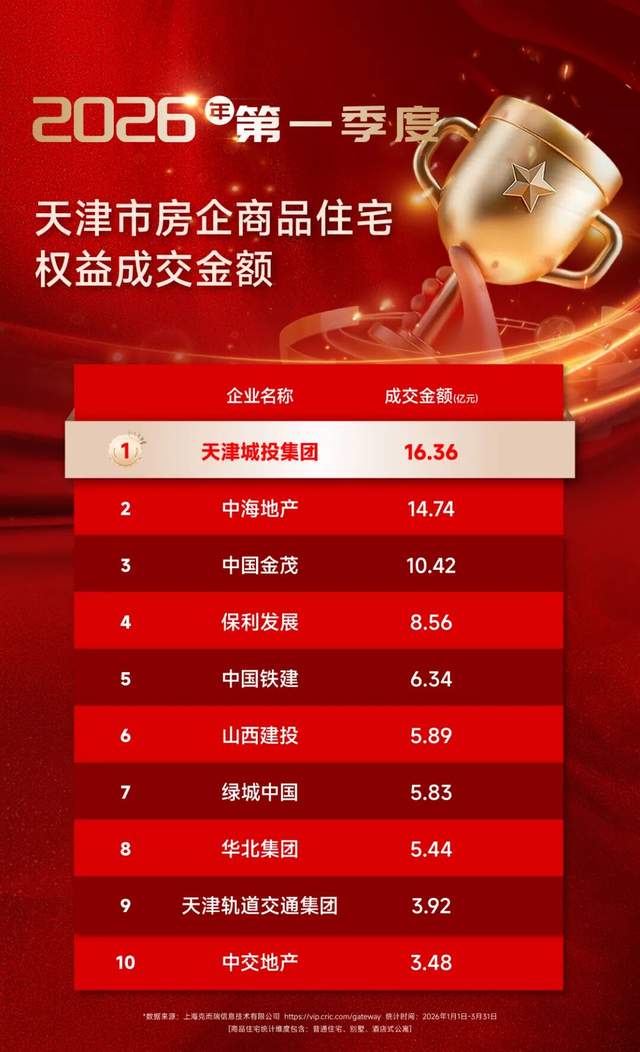 22、开门红:2026年一季度,天津城投集团以16.4亿元的权益成交金额,强势摘得天津房企权益成交金额TOP1,以实打实的业绩印证了本土国企的实力与市场号召力。其中,城投金茂府项目一季度销售额达5.0亿元,位居全市签约榜第一。