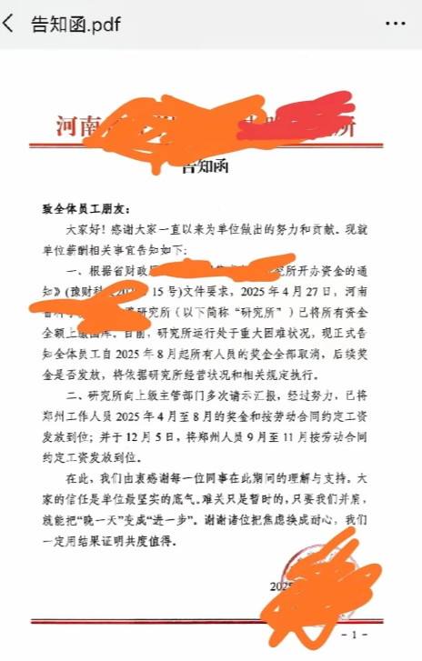 而对于大多数科研院所而言,最近的资金确实变得比较紧张,这不,河南的某研究所对内发了一个告知函,被疑似该所员工给曝光了。