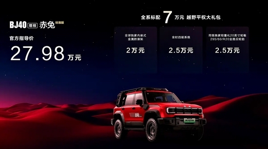 1月27日,北京越野BJ40增程赤兔版正式上市,新车共推出1款车型,售价为27.98万元。同时,官方还推出了多项购车权益。新车在BJ40增程版的基础上增加了多项改装套件,大幅提升了户外越野性能。