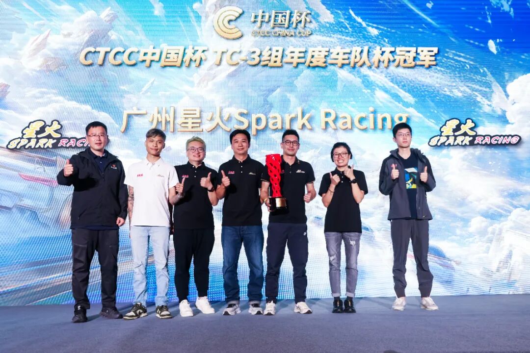 全体车手的坚守和努力汇聚为荣耀的巅峰——广州星火Spark Racing车队成功斩获CTCC中国杯年度最佳俱乐部与TC3组别年度车队杯冠军两项重量级荣誉,为赛季征程画下浓墨重彩的完美句点。