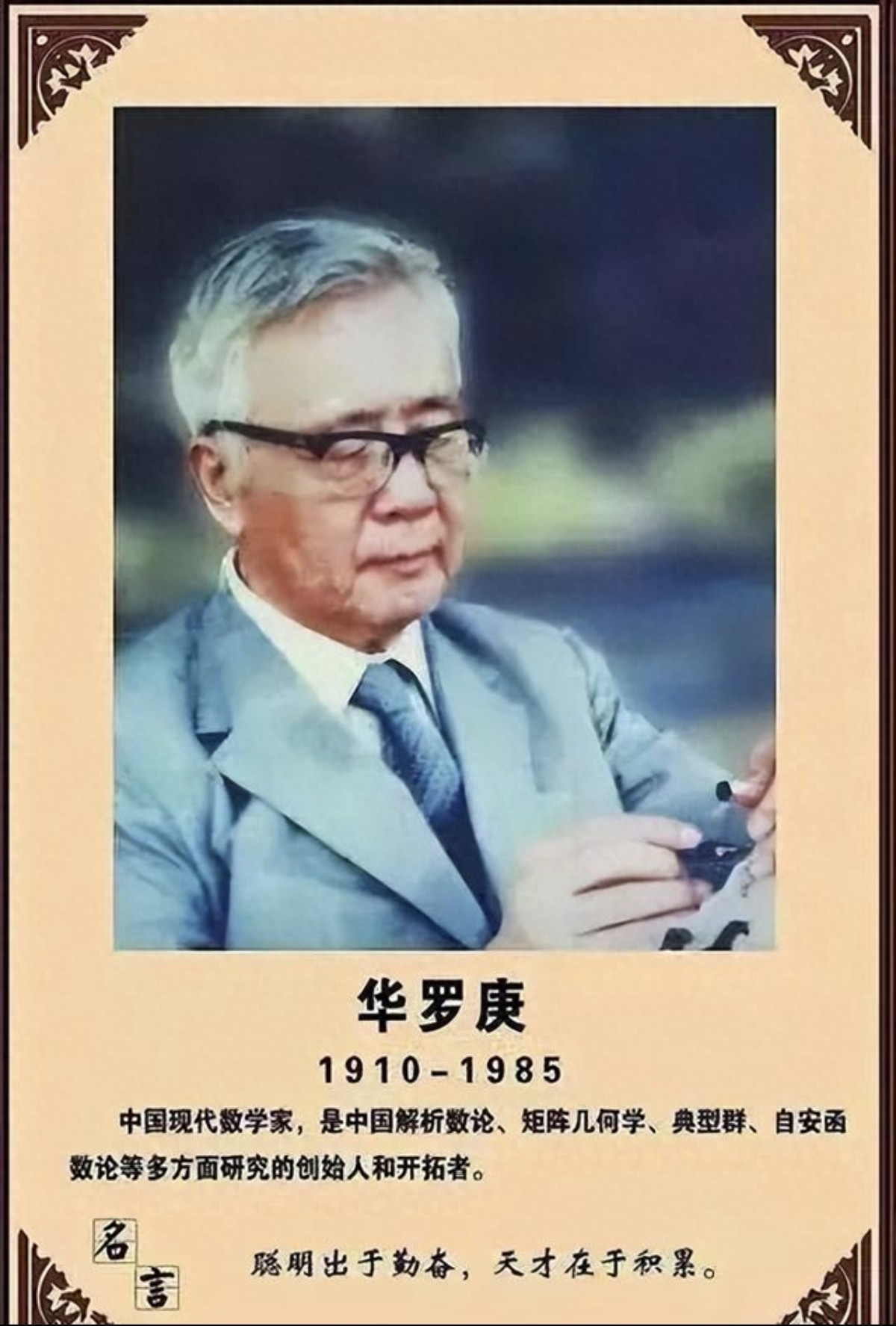 这个计算就是理论上每项有6个数相乘,共720项加加减减,当然实际上项数会少很多,但是华老做的心算,就算化简下来,怕也是有几十项或一百多项。 还有一次,华老带着自己的研究生和一些中学老师散步,途中看见一辆车,然后就问:“这个车牌能被7整除,但不能被11和13整除,为什么?” 大家一看,这个车牌号是31-03219,去掉连接号就是3 103219。大家都惊呆了:这算得也太快了吧! 这里我们回忆一下能被7,11,13整除的数的特点:用最后三位数字组成的数减去前面剩下的数字组成的数,如果所得的差是能被7,11,13整除的数,那么原数也就能被这三个数整除。但是,华老怎么能算得这么快呢? 啊,刚才华老好像抬头看了一眼云,难道这就是所谓的云计算? 华先生一看大家没反应,就笑嘻嘻地说:“晚上到我房间坐坐。”然后扭头跟研究生们说:“如果你们想出来了,就和中学老师们一起来;如果想不出,就别来了......” 你们体会一下当时研究生们的心情.....