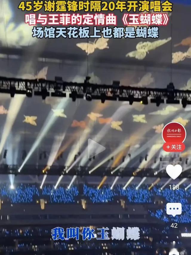 谢霆锋当着几万人的面高调示爱,唱和王菲的定情曲《玉蝴蝶》时,场馆上空无数只蝴蝶在闪动,那示爱的场面太齁甜了。