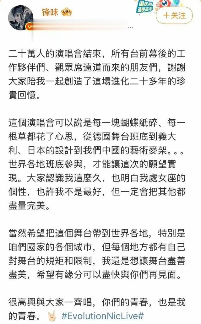 演唱会结束后,谢霆锋发文称他唱得是他的青春,也是很多人的青春。