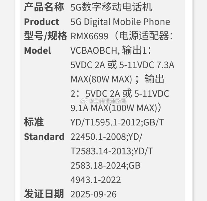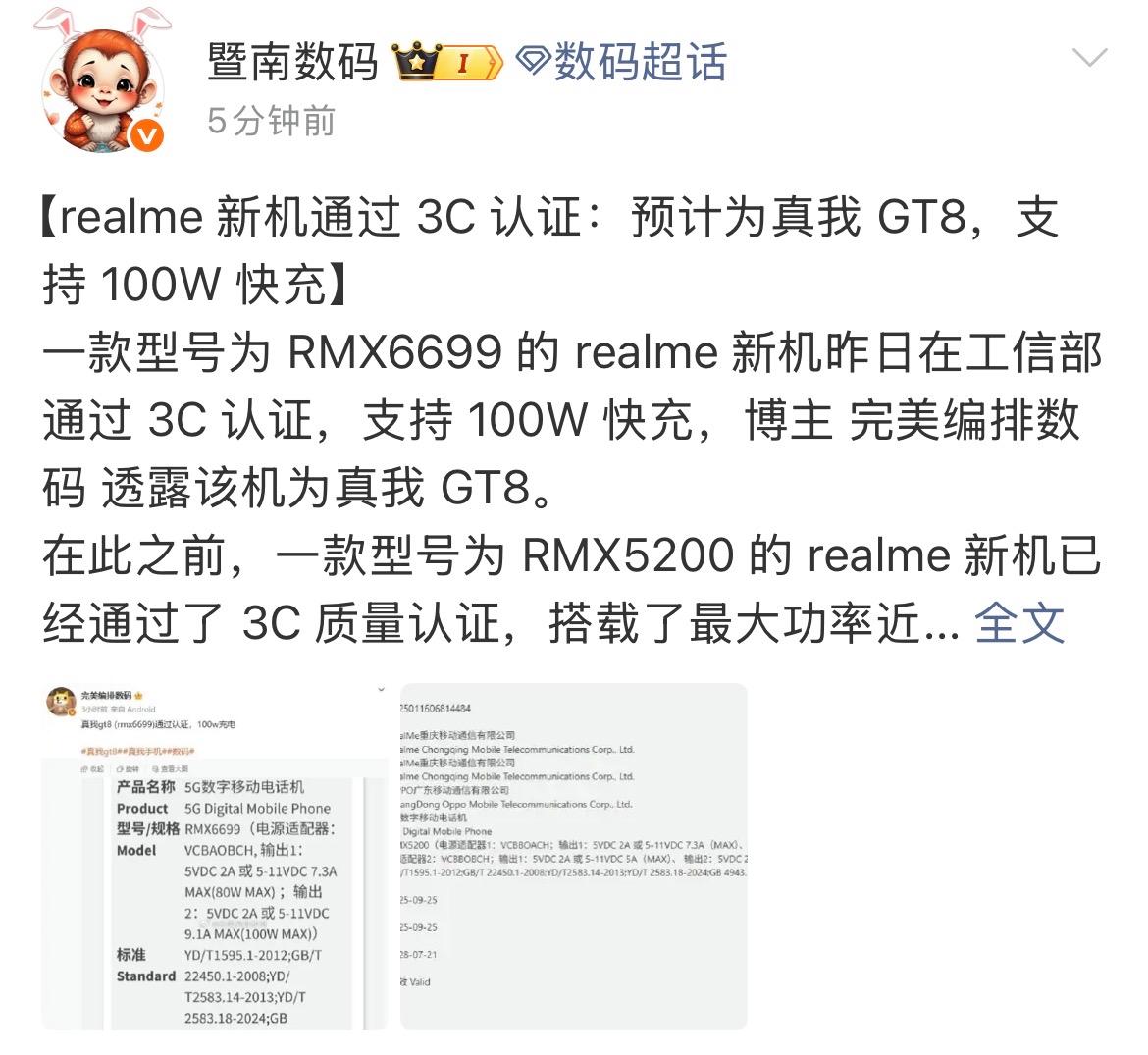 日前,数码博主“完美编排数码”爆料了一张新机获得国家质量3C认证的截图,并配文称,“真我gt8 (rmx6699)通过认证,100w充电”。随后,“暨南数码”转发了该条微博,并透露,“【realme 新机通过3C认证:预计为真我GT8,支持100W快充】一款型号为RMX6699的realme新机昨日在工信部通过3C认证,支持100W快充,博主 @完美编排数码 透露该机为真我GT8。
