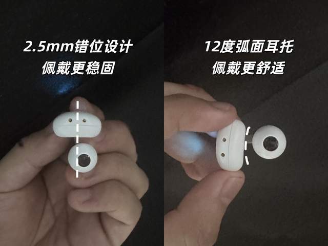 佩戴方面:采用了前高后低的2.5mm 错位设计,能恰好贴合耳朵形状,让佩戴更稳固;电池部分则做成∠12弧面耳托,可完美贴合耳背,进一步提升贴合度与舒适度。单耳仅 4.5g 的重量,佩戴起来不夹耳,几乎无感。