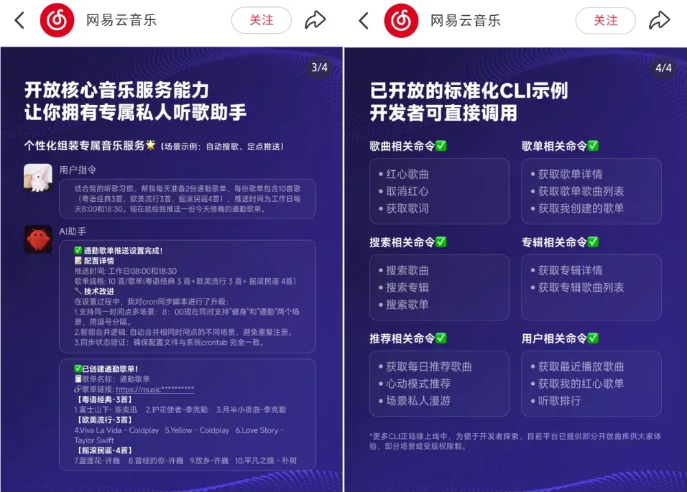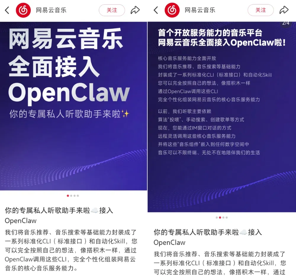 按网易云的说法,全面接入OpenClaw之后,用户可以通过其封装好的音乐推荐、音乐搜索等基础能力相关标准化CLI(标准接口)和自动化Skill,像搭积木一样,自行组装起个性化的专属音乐服务。