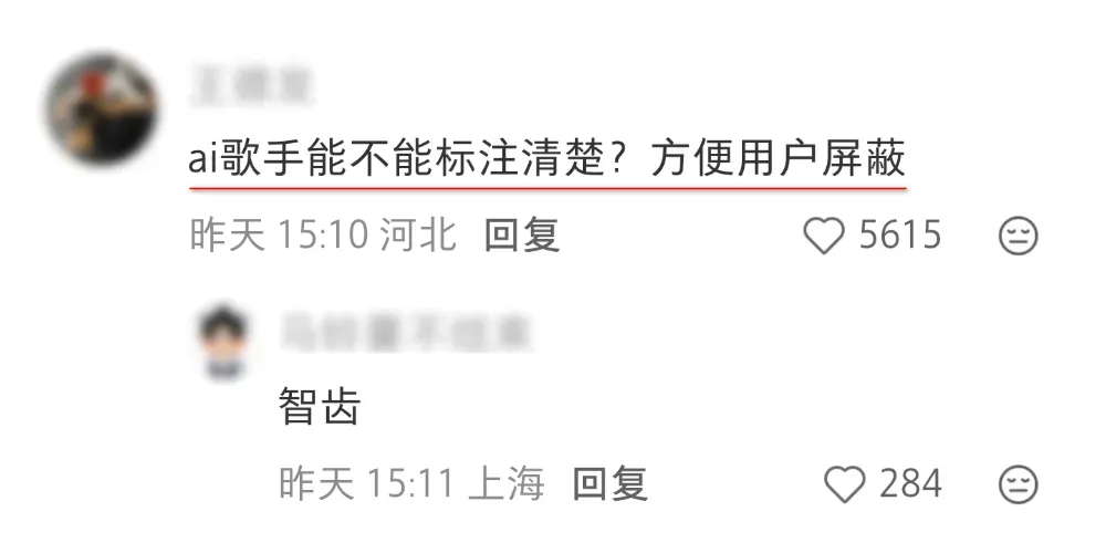 “网易云,你倒不如给AI歌手和AI歌曲打出明确标识,方便用户们屏蔽。”