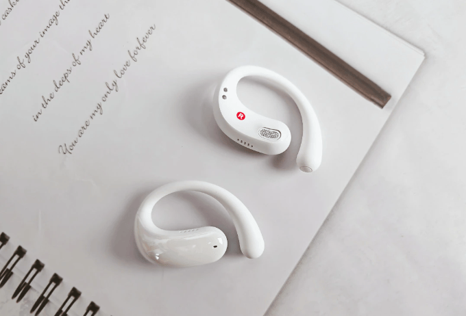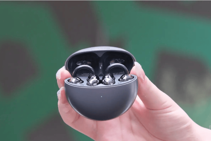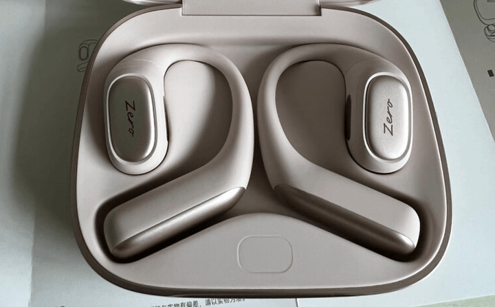 该款耳机外观由菱格皮纹覆盖,以电镀高光腰线切分,整机设计简约干净。机身采用食品级固态硅胶和类肤质感工艺,耳挂内部由镍钛合金记忆金属骨架制成。单耳克重是7g,佩戴起来舒适轻盈,牢固不易掉落。