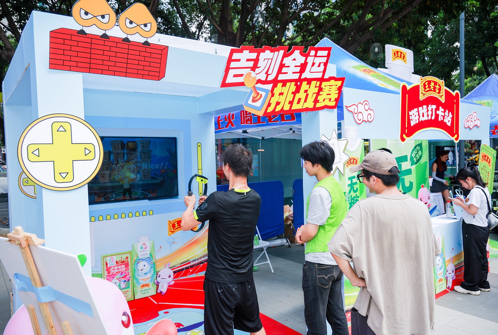 奥运冠军的到来,让“吉情全运 吉刻去拼”活动现场人气爆棚,吸引诸多市民到场打卡参观。王老吉精心设置了不同主题的打卡市集,市民们拖家携口,在“吉刻全运挑战赛”的全运游戏体验区,随机选择一项全运会比赛项目,如短跑、跳远等,用时髦的体感游戏方式,在大屏幕上过一把亲自参加全运会的“参赛瘾”,而在投篮游戏面前,很多街坊都忍不住“一显身手”。