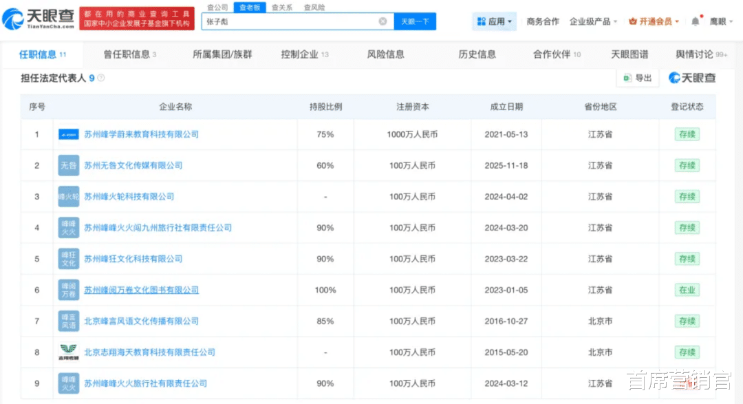 数据显示,张雪峰名下关联着11家公司,9家仍在存续。