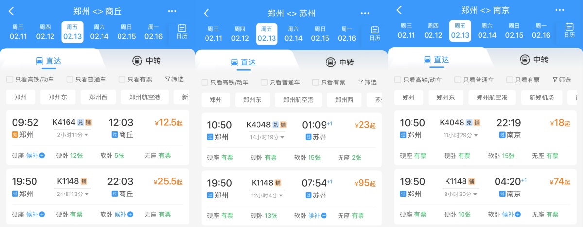 记者查询12306发现,作为全国重要铁路枢纽,春运期间郑州多方向列车仍有低价余票在售。省内方面,郑州前往开封的K4048次列车仅售价为2.5元;郑州开往商丘的K4146次列车仅售价为12.5元;省外方面,郑州开往上海的K4048磁力车仅售价为24.5元;郑州开往北京的G4480次列车售价为74元;郑州开往杭州的K4146次列车售价为53.5元;郑州开往苏州的K4048次列车售价为23元;郑州开往南京的K4048次列车售价为18元。