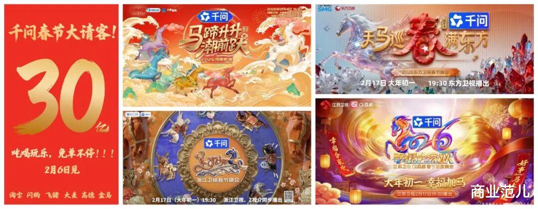春节AI红包大战在2026年初达到白热化。2月2日至3日,阿里千问宣布投入30亿元启动“春节大请客”,且独家冠名了东方卫视、浙江卫视、江苏卫视、河南卫视四大马年春节晚会,成为目前最大手笔的玩家。