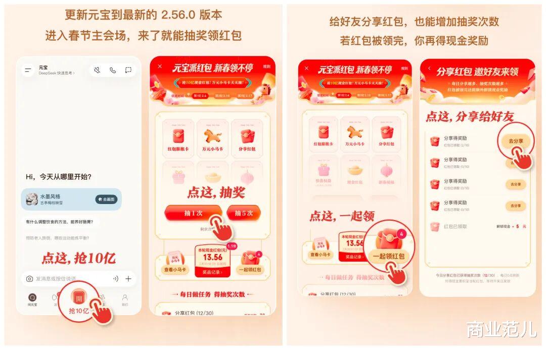 这场战役中,腾讯早在1月25日就宣布于2月1日在元宝APP上线春节红包活动,发放总额10亿元的现金红包。