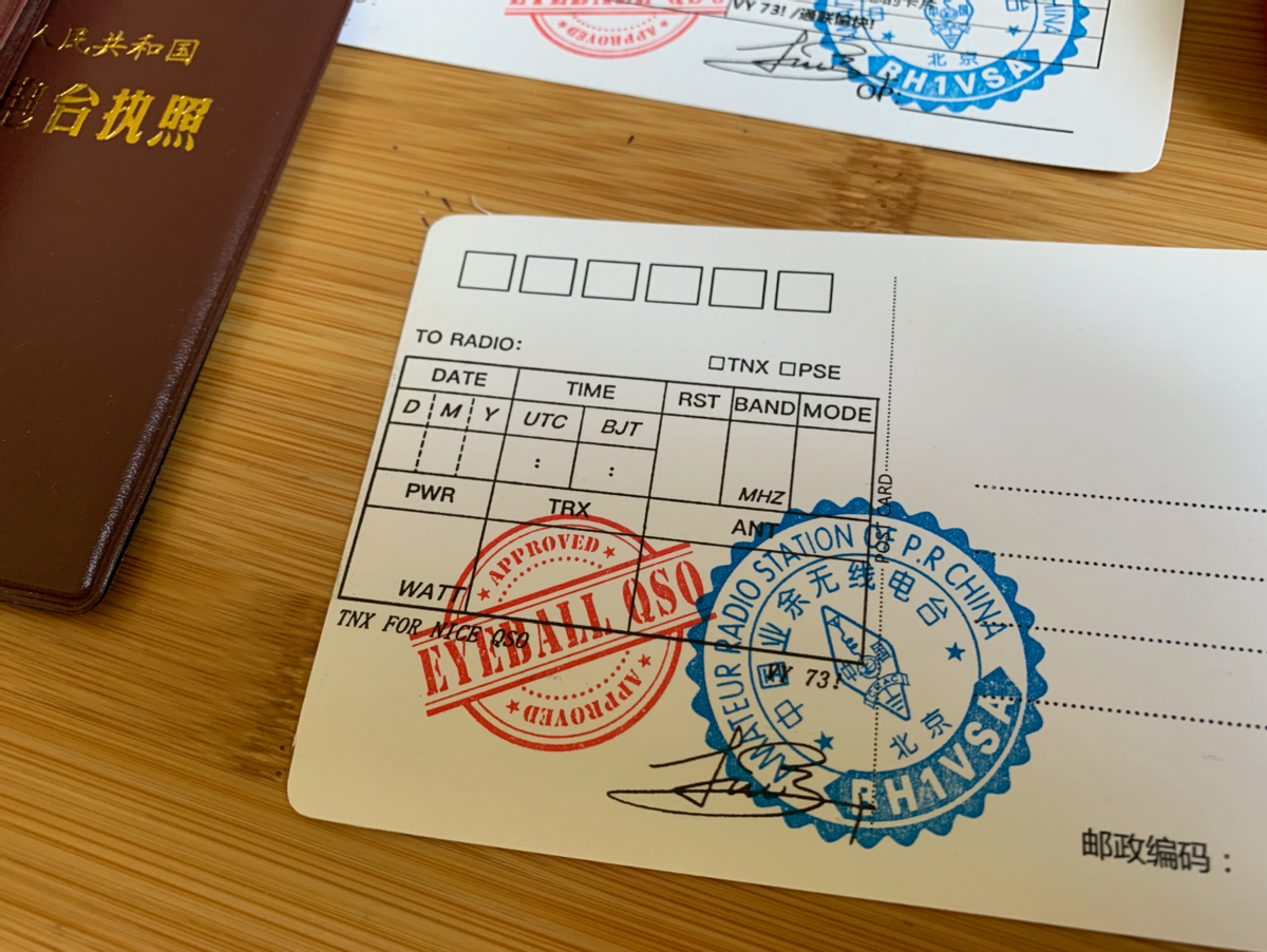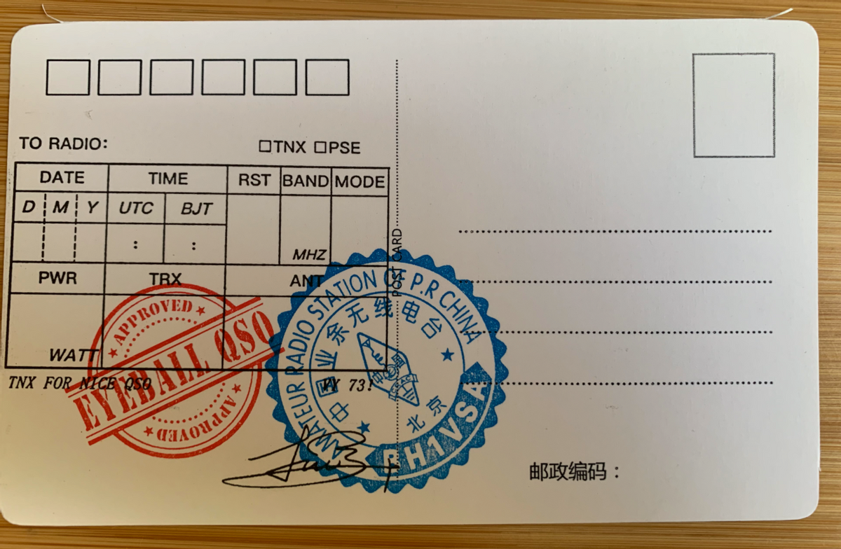 明信片QSL卡片:QSL表格印章盖到明信片的空白处即可,然后呼号印章、签名印章和眼球印章(如需要)盖到同上的相应位置。