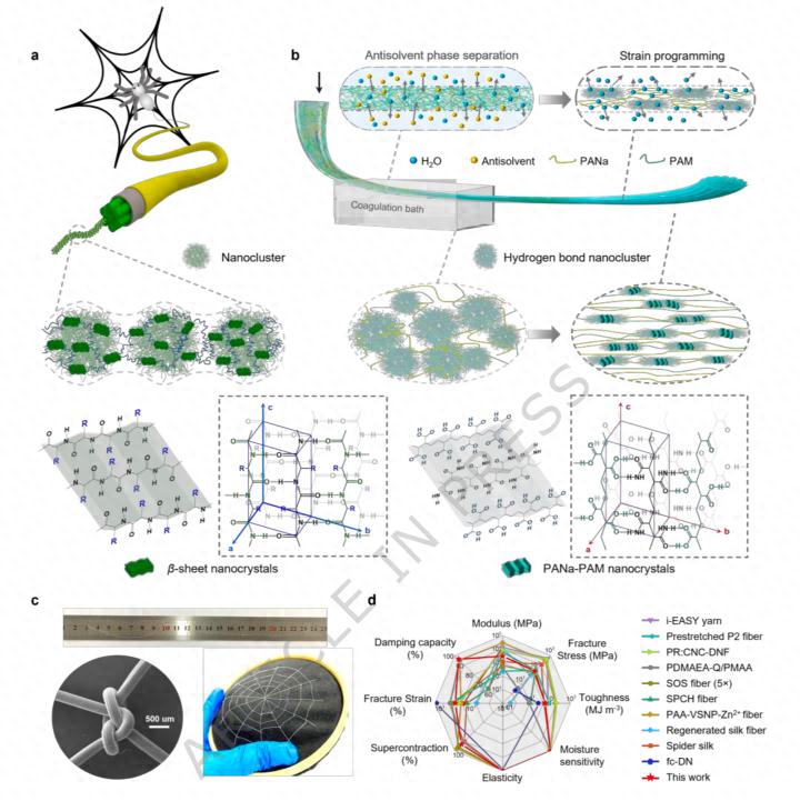 a:天然蜘蛛丝拥有精妙的多级结构,是性能奇迹的蓝图;b:研究人员模仿这一过程,通过“湿法纺丝”形成初生纤维,再经“后拉伸”进行结构编程