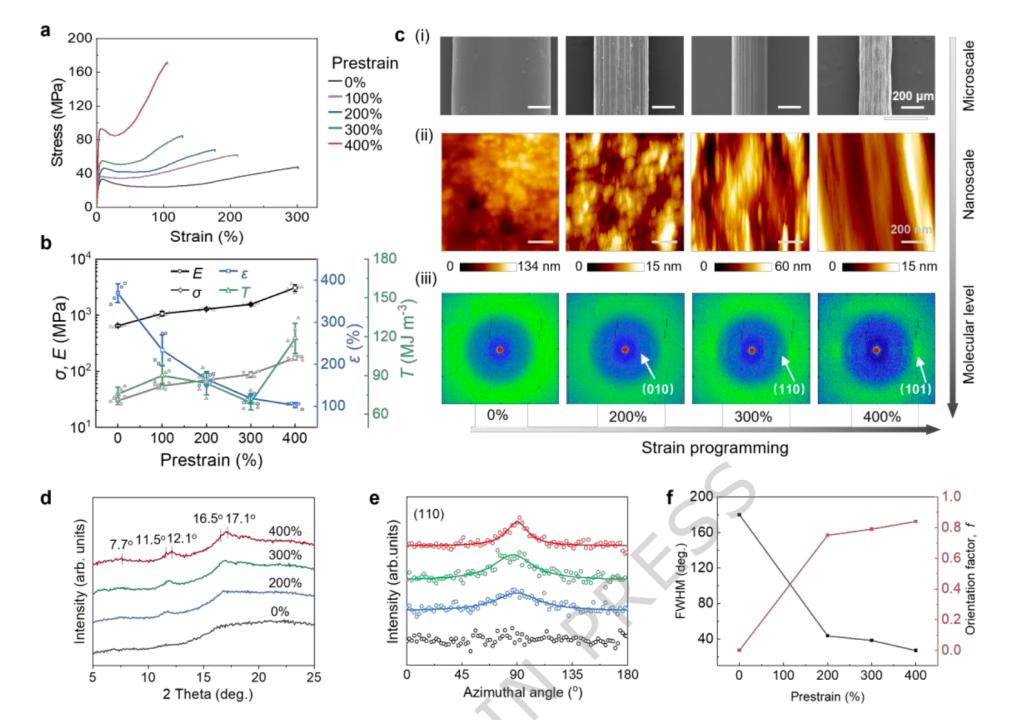 预拉伸不仅使高分子链沿着纤维轴方向排列,还促进了氢键网络的重组和取向结晶的形成。经过400%预拉伸的纤维,在X射线下显示出高度的分子有序性,其结晶形态与蜘蛛丝中的β-片层晶体在功能上异曲同工。