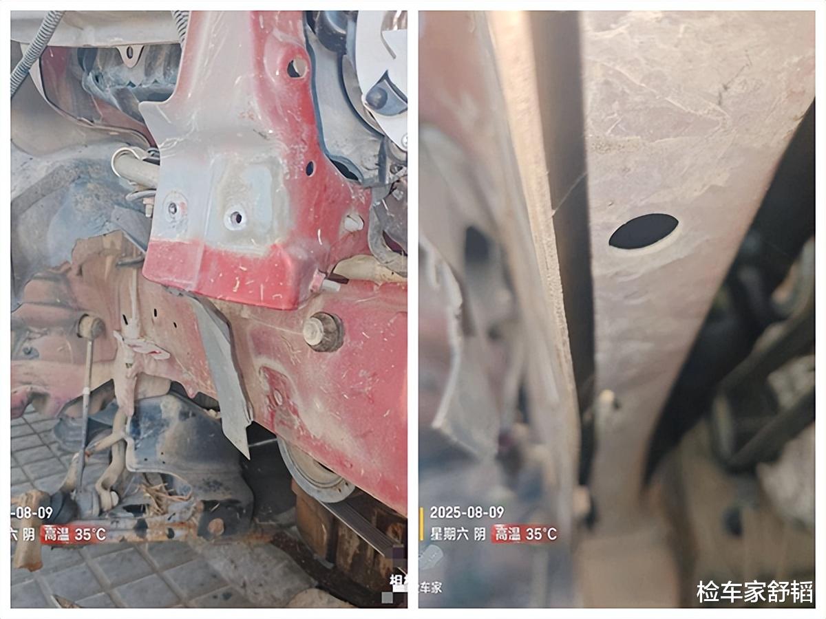 右侧纵梁弯曲变形,从下面看的更清晰,修肯定是要修的,不然车架就是歪的!