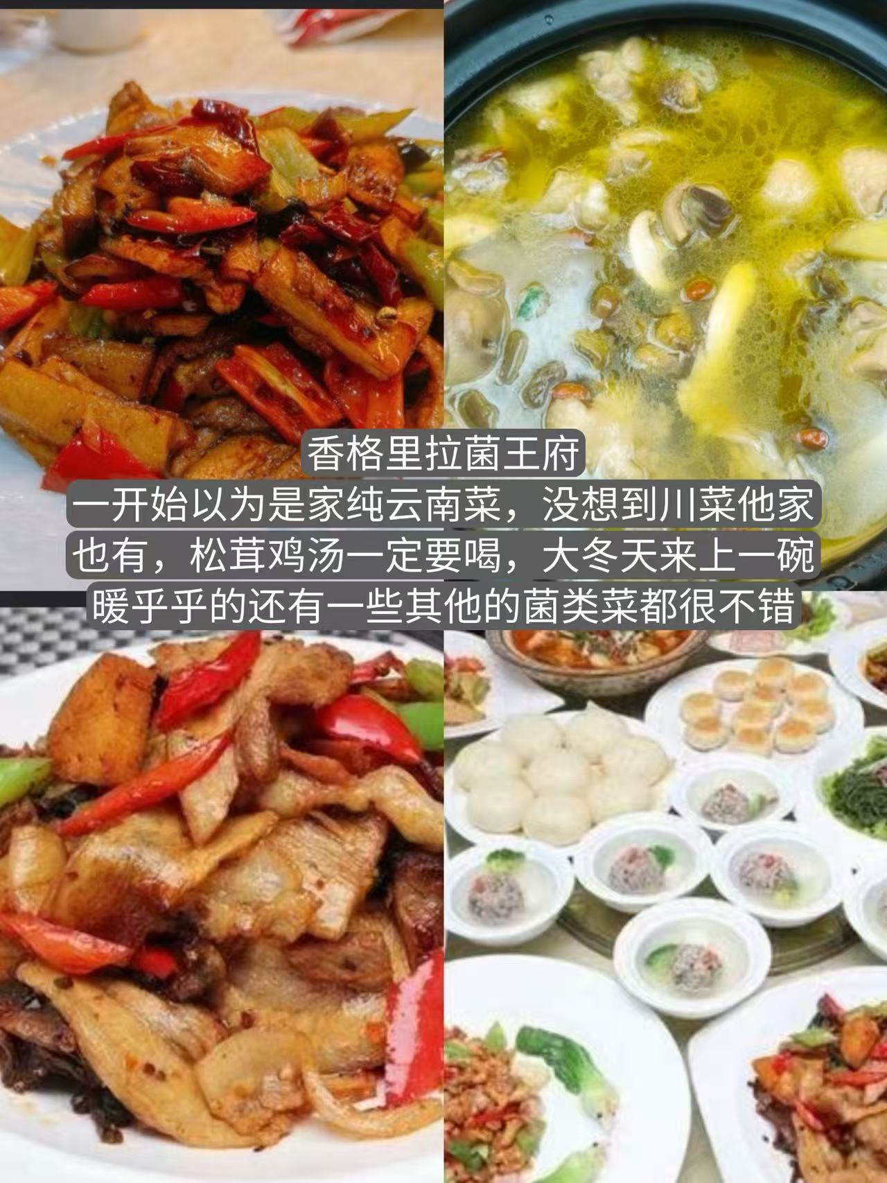 一开始以为是家纯云南菜,没想到川菜他家也有,松茸鸡汤一定要喝,大冬天来上一碗暖乎乎的还有一些其他的菌类菜都很不错