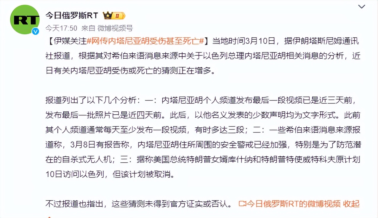 当然也有不少网友表示怀疑,可是媒体还报道说,据称美国总统特朗普女婿库什纳和特朗普特使威特科夫原计划10日访问以色列,但该计划被取消。另外,在3月8日的时候有媒体报告称内塔尼亚胡住所周围的安全警戒已经加强,特别是为了防范潜在的自杀式无人机;而最近几天伊朗的反击频率也确实高,虽然不知道能不能精准打击到内塔尼亚胡,可是万一有一枚导弹落在他住的地方也是有可能的。