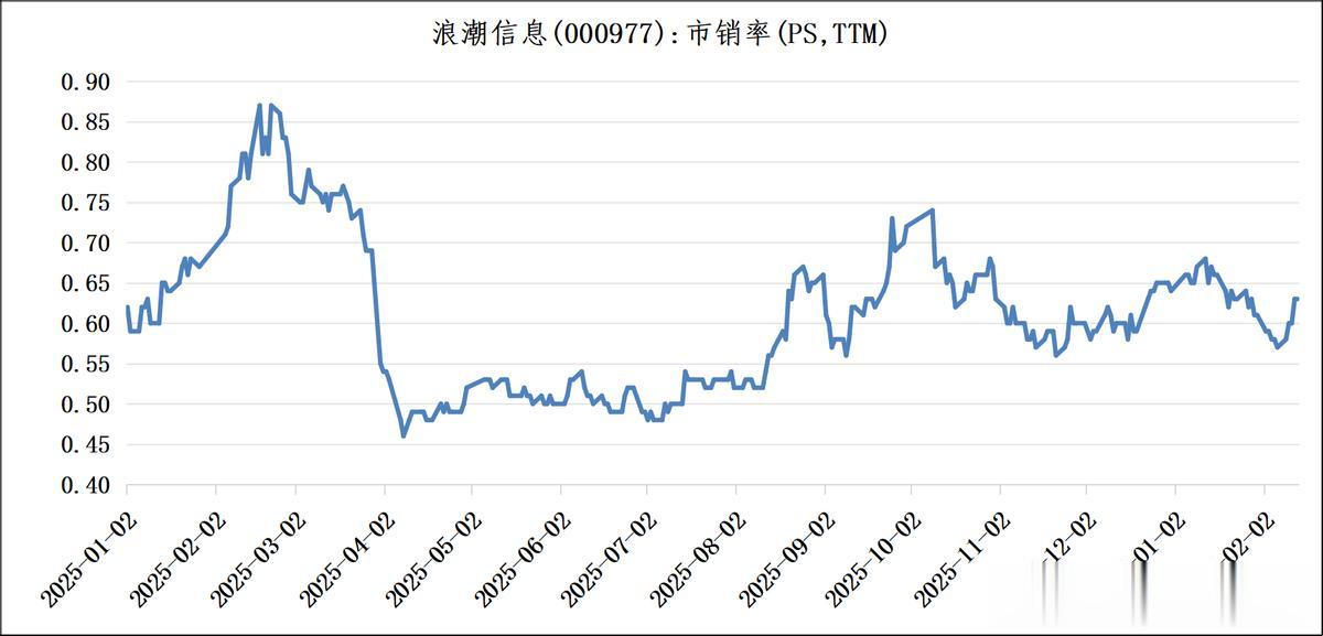 从2025年至今,浪潮信息的市销率(PS,TTM)呈现出“冲高回落、探底回升、震荡运行”的走势,整体围绕0.6的平均值波动。2025年初至3月,公司市销率持续上行并触及阶段高点,随后在4月快速下探至年内低位0.5附近。