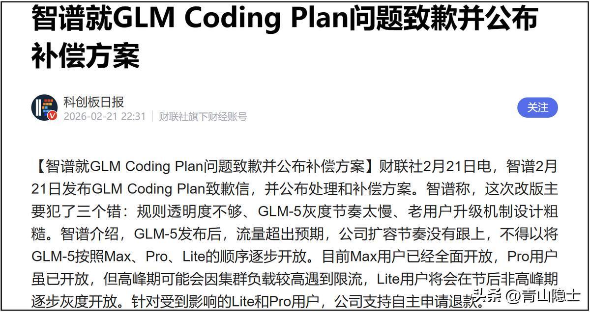2月22日,顶着“全球大模型第一股”光环的智谱AI,在股价暴涨42.72%、市值突破3200亿港元后,因GLM-5大模型上线后运营承压发布致歉信,直指算力消耗激增、资源扩容滞后、用户体验波动三大问题。