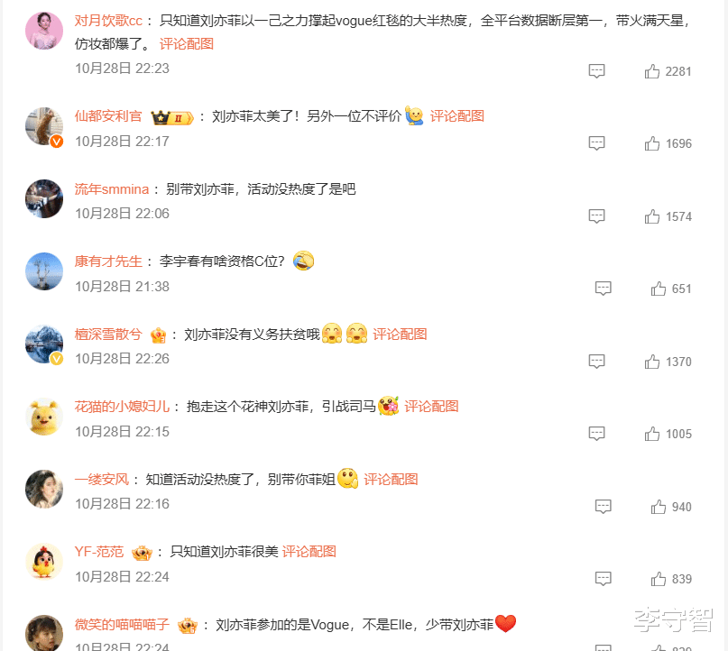 但这样一来矛盾反而转移了,刘亦菲李宇春两位曾经在前辈面前不争C位能同台同框的顶流,现在各自为王,居然不能同台同场了。本来两人这次也是避开了彼此,各种艳压和压轴及C位,但是偏偏就是这样,反而被放在一起比较,于是引发两家粉丝争议,到底两位谁更美更火更有气质更能压轴的争议,双方各执一词,争得不可开交。这或许就是不比作品演技拼人气必然会有的局面,不过双方粉丝各种偏爱不同,没必要硬拼,个人喜欢就好,没必要分个高低胜负。