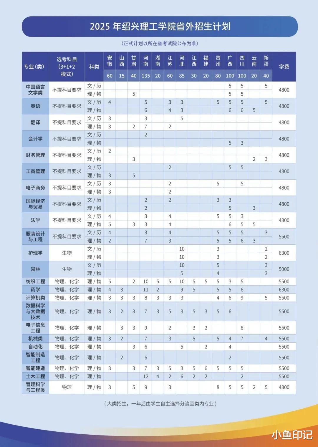 从绍兴理工学院发布的最新招生政策来看,2025年面向全国15个省(市、自治区)招生计划总数为1930人,普通类专业的学费在4800元到6300元之间/年。