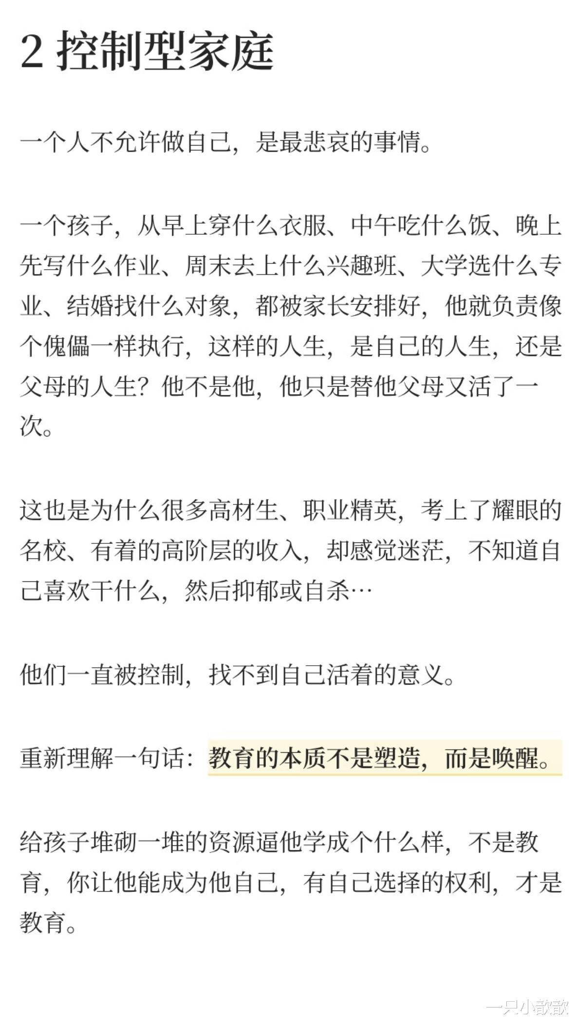 过度控制型家庭,有些父母把孩子当成自己的附属品,觉得孩子的一切都得由自己来安排,从孩子穿什么衣服,到交什么朋友、报什么兴趣班,父母都要一一过问,严格控制,孩子没有一点自主选择的权利,就像被绳索捆绑的小鸟,无法自由飞翔,这种过度控制会让孩子产生强烈的逆反心理,他们渴望摆脱父母的束缚,追求属于自己的自由,一旦有机会,就会迫不及待地逃离父母的掌控,和父母的关系也会变得紧张起来,等孩子长大后,他们可能会因为长期被压抑而和父母产生隔阂,不愿意和父母亲近。