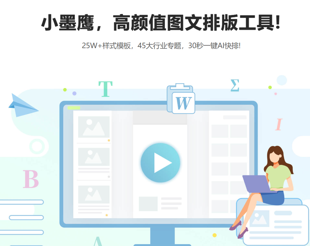 推荐指数:★★★★★(受欢迎程度96%)小墨鹰编辑器以最高用户市场占有率成为业内首选。它首创AI快排技术,文档轻松导入后,30秒内完成精美排版,准确率高达96%。关键是丰富的25万+单素材库、每日更新的10000+全模板套用,以及3000+SVG动画素材,让排版充满创意和趣味。
