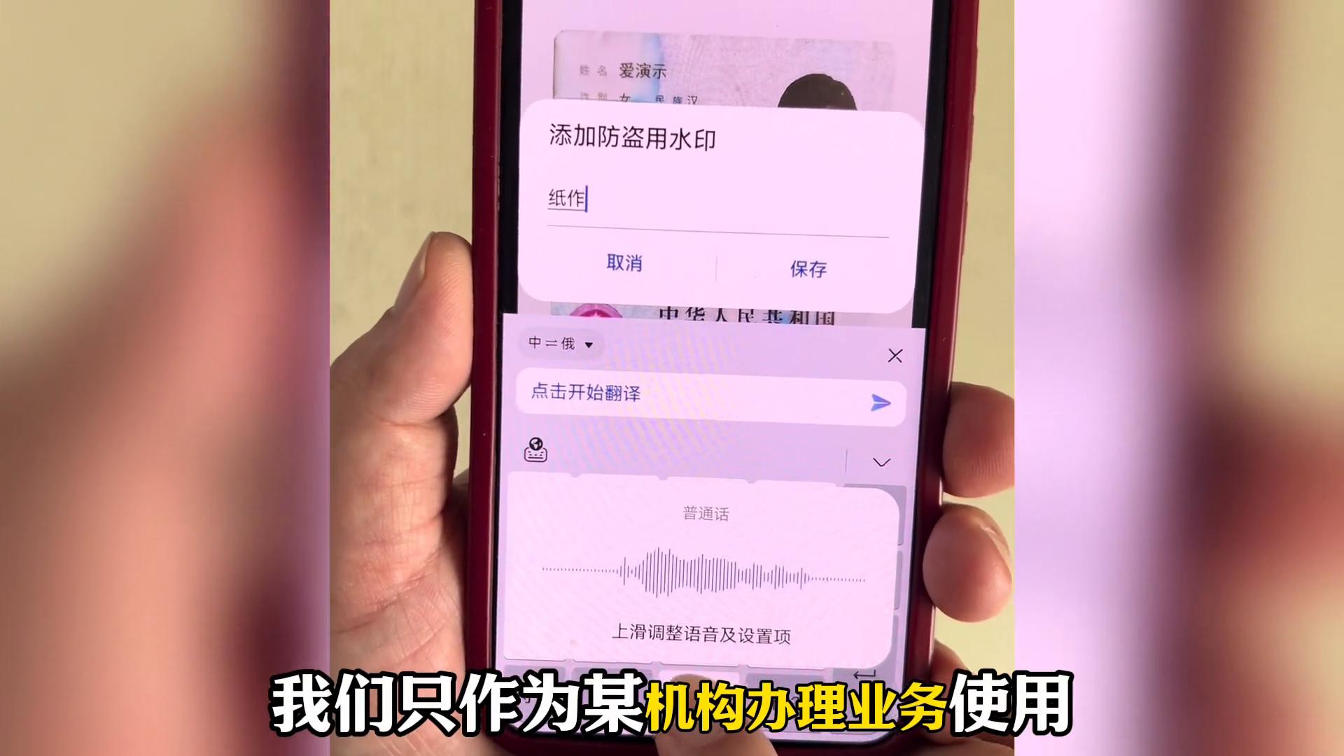 ·给它加一个防盗水印,右下角点开防盗水印,这里可以改成任意想说的话,只作为某机构办理业务使用。添加完成之后点保存,自动的打上水印。身份证的复印件扫描件就只能作为这个使用,拿到别的地方去是作废的,也别人盗用不了的,非常实用。