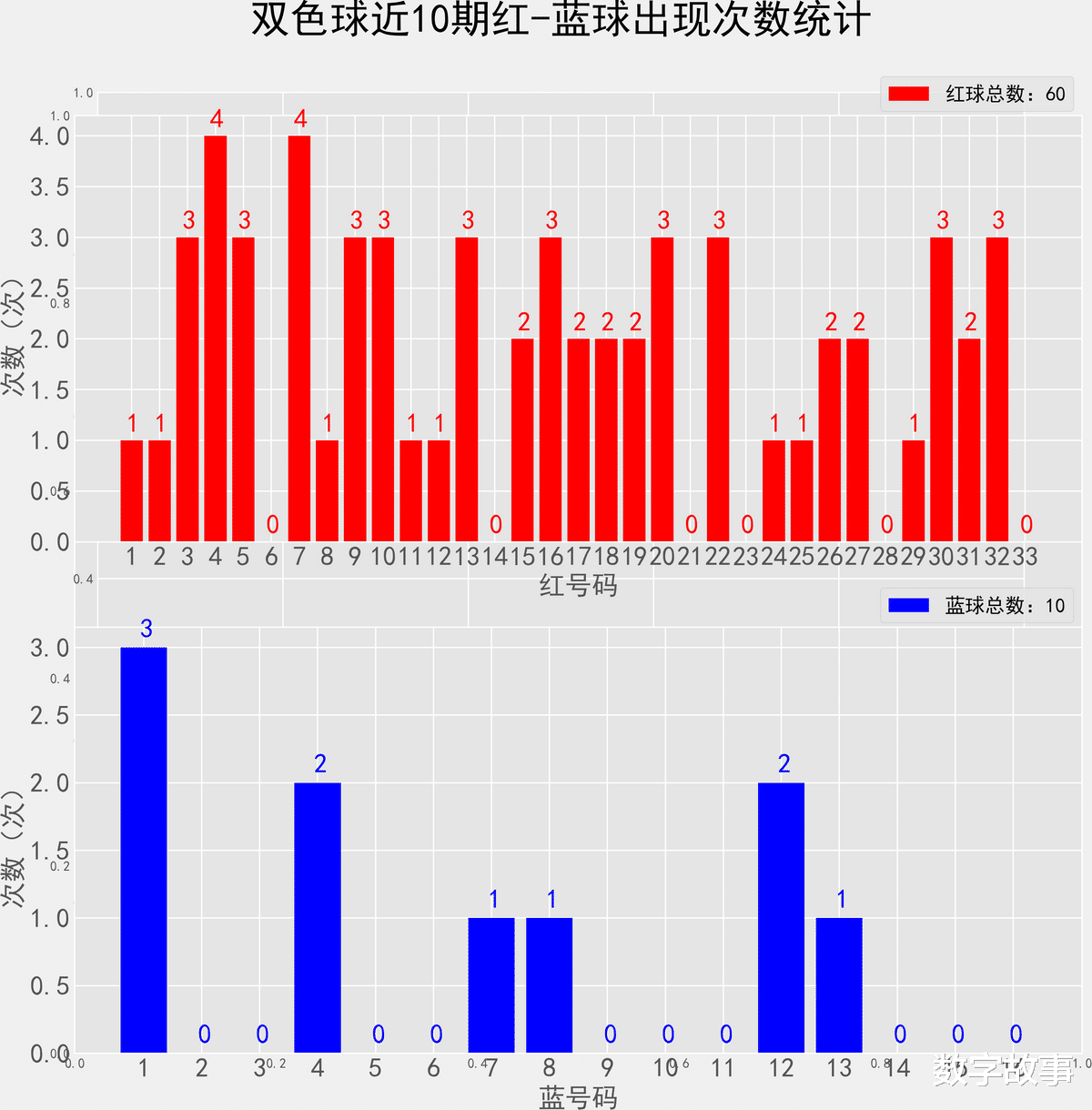 双色球近10期红蓝号统计情况统计样本数据: 60个红球 10个蓝球