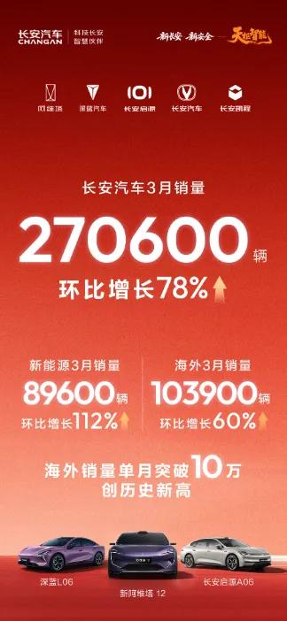 2026年4月1日,长安汽车发布3月销量数据:全月销量突破27.06万辆,环比增长78%;海外销量达10.39万辆,环比增长60%,创历史新高;新能源销量达8.96万辆,环比增长112%。在汽车消费政策切换、上年末市场需求提前释放的行业背景下,长安汽车交出了一份逆势上扬的成绩单,展现出新央企稳健的增长韧性与高质量发展成色。