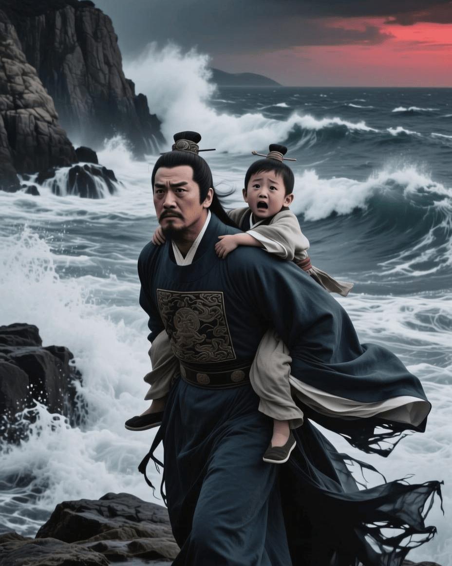 说罢,背起八岁的赵昺,颈挂玉玺,又用素白绸带将之与自己身体紧束一起,然后一步一步走向船舷。参知政事单公选等一干内臣,也扶持左右,步步紧随,随之跳入茫茫大海。