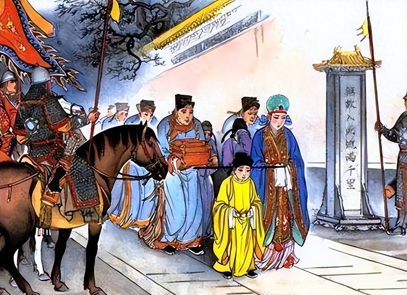 第二天,在蒙古骑兵监视下,宋恭宗与生母全太后,连同后妃、宗室、百官、太学生数千人走出临安城。象征着皇家权威的卤簿、冠服连同金银珍宝被运上一辆辆大车,一同运往元大都。