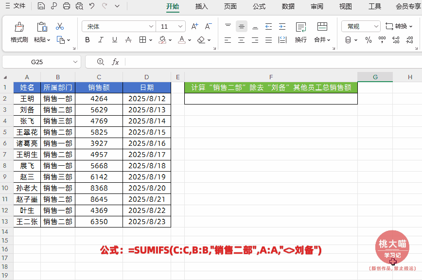 如下图所示,计算“销售二部”除去“刘备”其他员工总销售额