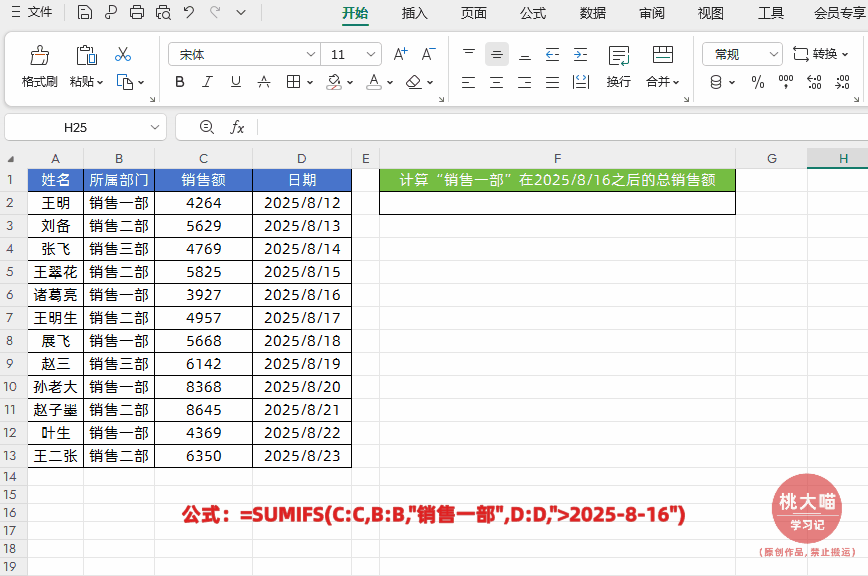 如下图所示,计算“销售一部”在2025/8/16之后的总销售额。