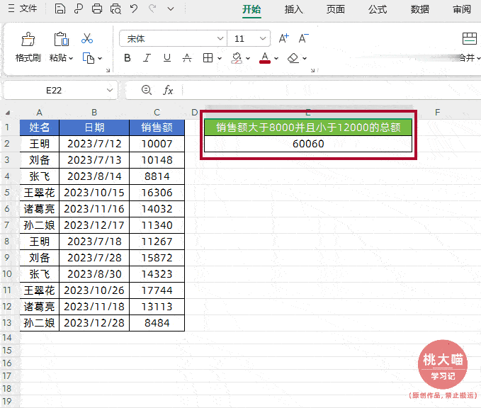 如下图所示,计算销售额大于8000并且小于12000的销售总额。