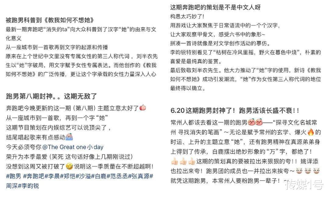 在微博、小红书等社交平台,刚刷完《奔跑吧13》第八期节目《消失的TA》之后的观众纷纷化身「自来水」,为节目以游戏化的形式从「她」字的科普里引出「她自由」的故事而疯狂安利。话题#被跑男科普到了她的来历# 登微博主榜。