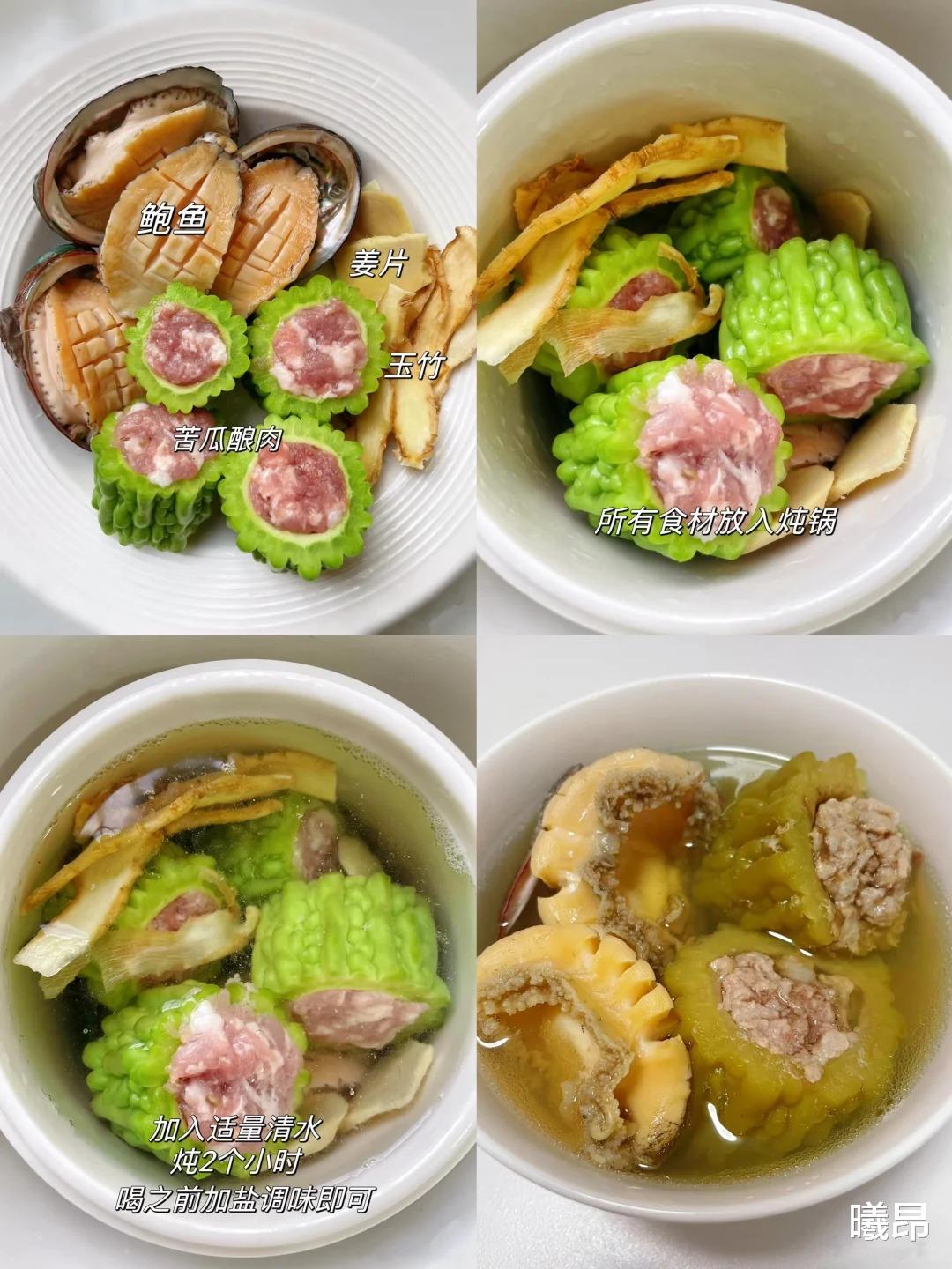 食材:鲍鱼 3 只、苦瓜 1/3 根、干贝 3 粒、肉沫 80g、姜片 1 片、蜜枣 1 个、盐适量