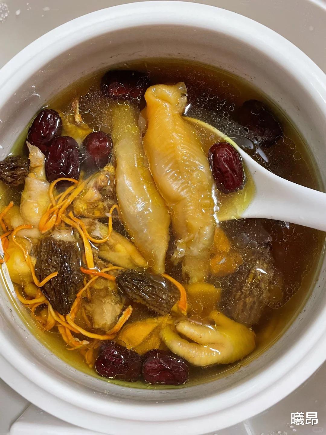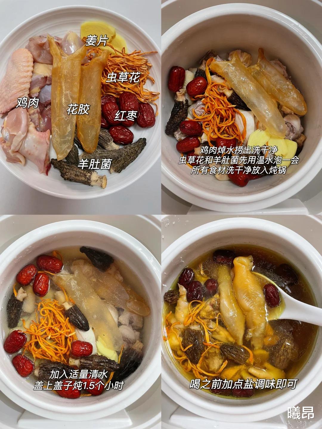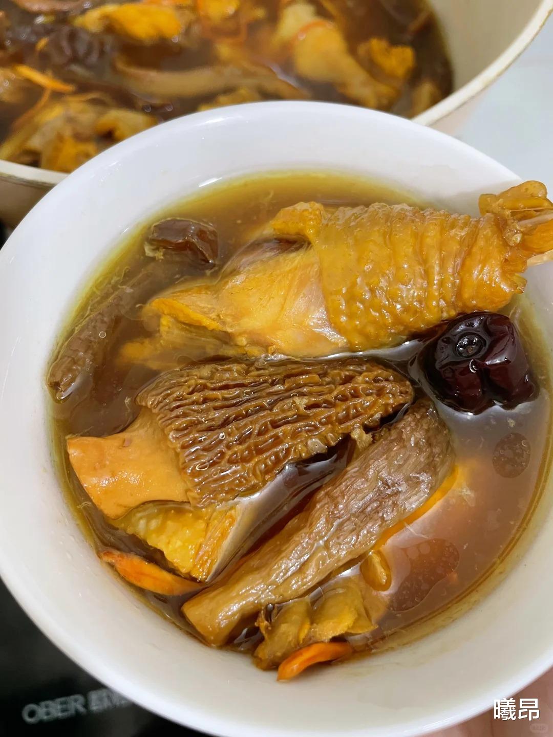 食材:老母鸡半只、花胶 10g、羊肚菌 15g、红枣 5 颗、姜片 5 片、料酒 2 勺、盐适量