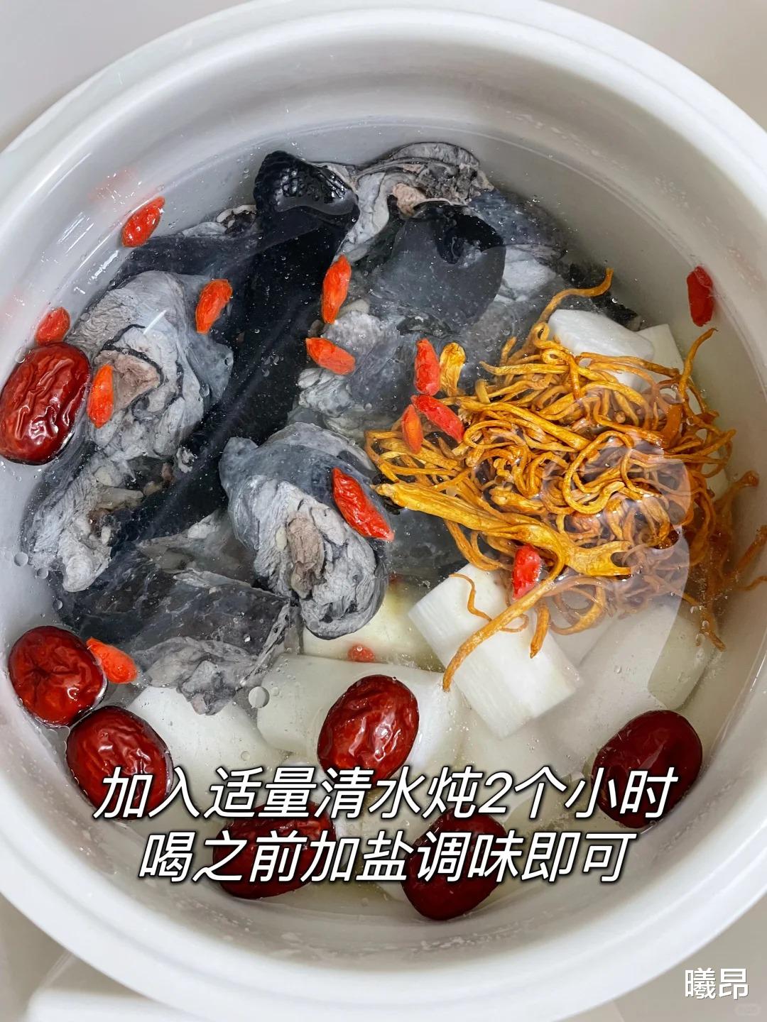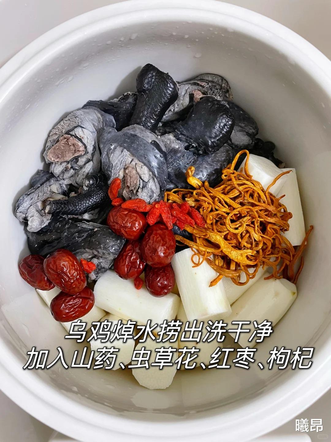 2.砂锅放乌鸡、3 片姜、去核红枣、虫草花,加开水没过食材,小火炖 80 分钟。