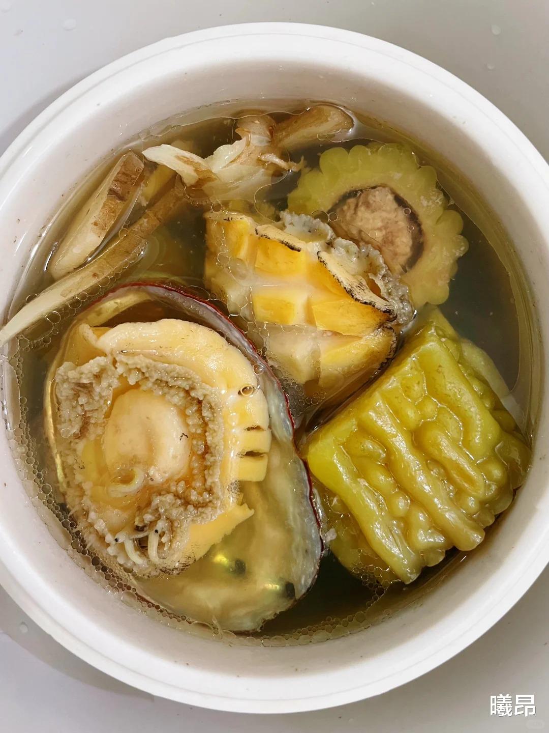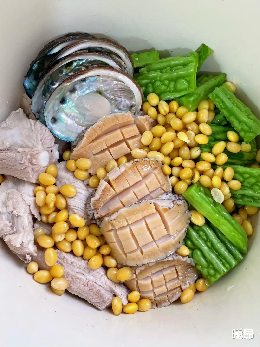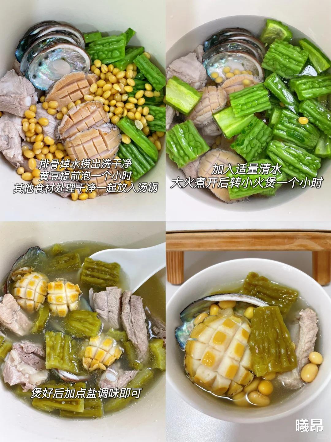 食材:鲍鱼 6 只、排骨 250g、苦瓜 1 根、黄豆 50g、姜片 3 片、盐适量