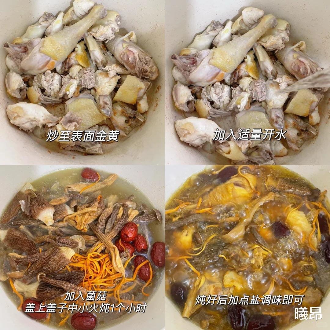 2.热油爆香姜片、葱段,下土鸡炒至微黄,加开水和所有菌菇,大火烧开转小火炖 1.5 小时。