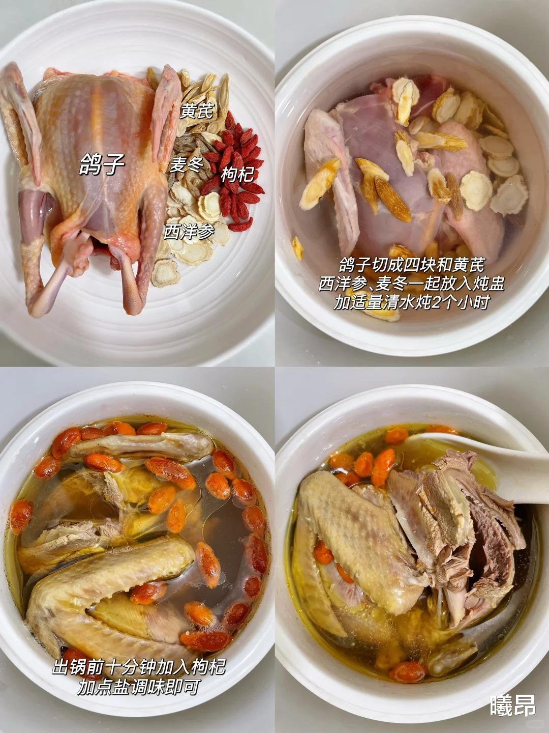 食材:鸽子 1 只、西洋参 5g、姜片 3 片、料酒 1 勺、盐少许