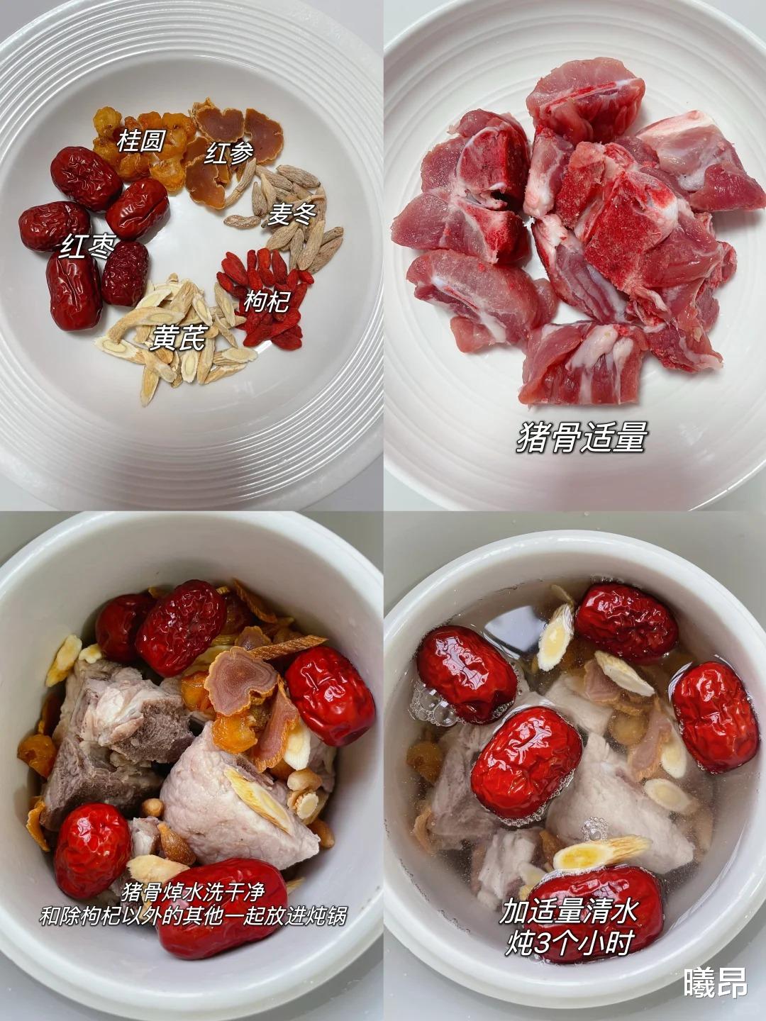 食材:猪骨 500g、黄芪 20g、红枣 6 颗、姜片 3 片、料酒 1 勺、盐适量