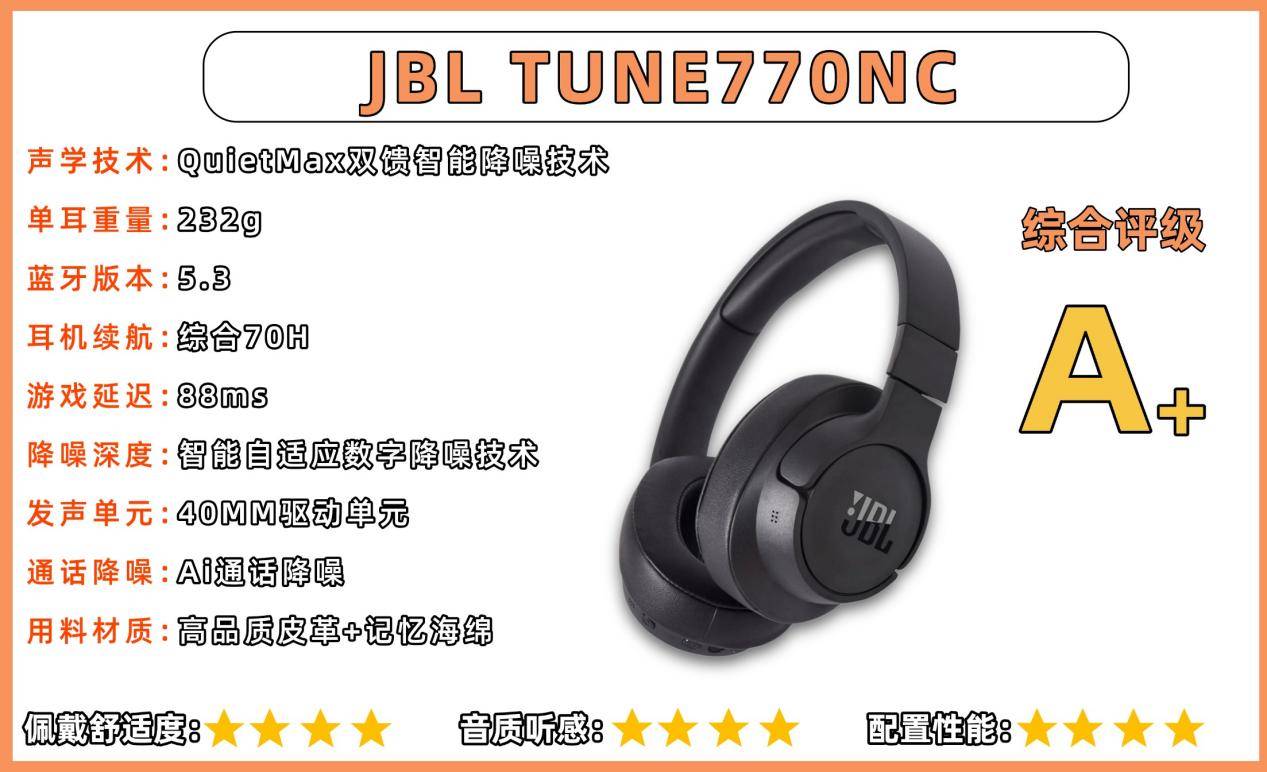 降噪方面采用自适应主动降噪技术,可根据环境自动调整强度,在地铁、公交等场景中能有效削弱噪音。续航表现出色,关闭 ANC 时最长可用约 65 小时。整体来看,JBL Live 770NC 兼顾舒适度与音质细节,适合通勤与日常使用,但高频偏亮及眼镜佩戴体验是主要短板。