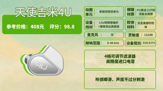 声音取向偏向平稳耐听,单磁双腔结构配合 PU 悬边与 LCP 球顶复合振膜,并不是那种追求刺激感的调校。解析力属于同价位的中间水准,细节呈现不夸张,整体更强调连贯性。高频亮度偏收,延展感保守,优点是听感温和、不容易刺耳,对耳朵比较友好;但如果偏好通透、高亮的声音风格,可能会觉得少了一点空气感。人声位置自然偏松,低频量感适中,弹性不强,更偏柔顺氛围型。线材使用 Litz 铜镀银结构,抗缠绕表现一般,听诊器效应在可接受范围内。导管较长并带有限位设计,对部分耳套的兼容性有限,需要多尝试几种尺寸才能找到合适组合。整体来说,4U 更适合追求小巧佩戴、耐听取向,而不是冲着高解析去的用户。