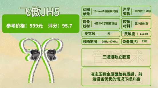 声音架构为一圈四铁的三分频设计,10mm 碳基振膜负责低频和整体声底,人声表现自然顺滑,是这款耳机比较突出的部分。高频控制得较为温和,不刺耳,也不会出现明显糊感。声场层次感偏保守,在编曲密集的段落中,分离度略有下降,这是它的主要短板。整体调音思路偏向耐听取向,不强调极限解析或强烈刺激感。面板为液态压铸金属,线材采用 4 股铜镀银结构,基础用料扎实,但细节处理仍能看到胶水痕迹,加上镜面面板容易划伤,耐用性和精致度表现一般。耳机不支持麦克风功能,定位更偏向纯听音用途。整体来看,JH5 在佩戴舒适度和声音耐听度上表现不错,但做工细节与功能性略逊一筹。